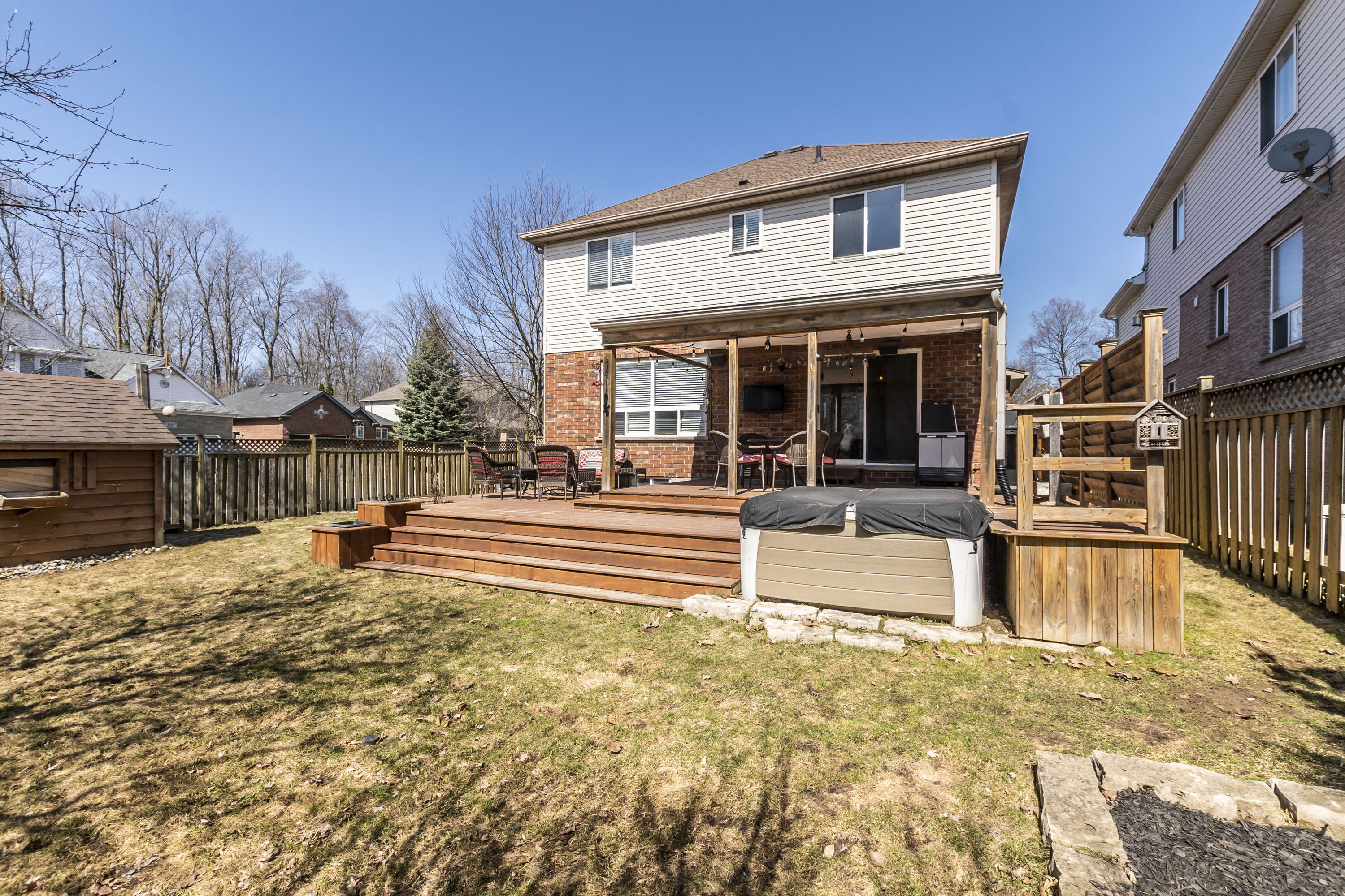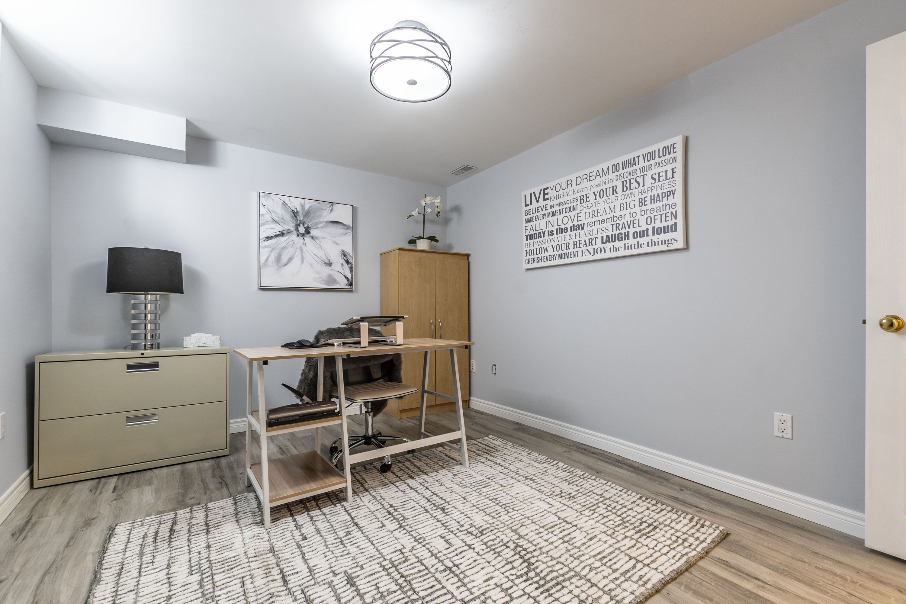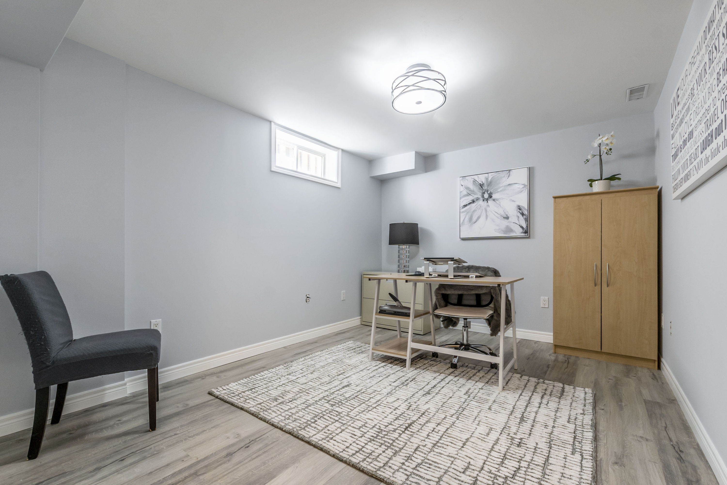 The functional kitchen combines practicality with style, featuring white cabinets and dark countertops for contrast. A convenient peninsula adds extra prep space & extra seating, while stainless steel appliances, including a dishwasher, make meal preparation efficient. The backsplash and open shelving provide both utility and visual appeal. There's also a separate drinking water tap featuring purified reverse osmosis water.